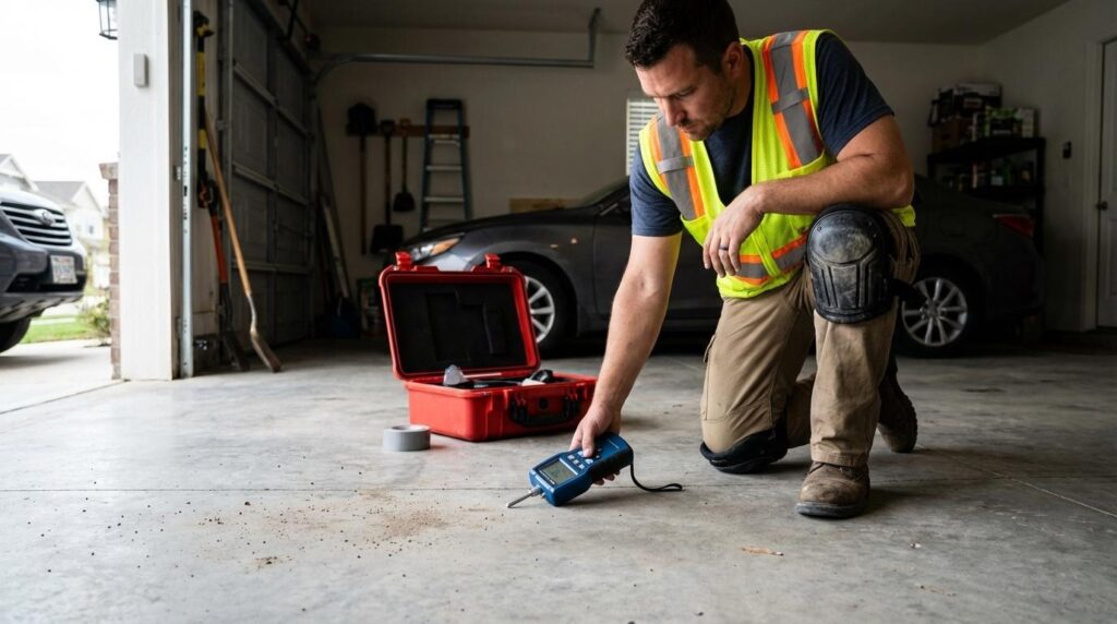Applying epoxy when concrete is warming up, such as a spring morning that heats through the afternoon, causes air in the slab to expand and push outward just as the coating begins to cure. Professional installers test concrete moisture levels before starting any project. Industry standards call for moisture vapor emission rates below 3 lbs per 1,000 square feet over 24 hours. Readings above that threshold mean the slab needs a moisture mitigation primer before any coating goes down.