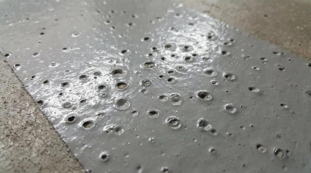 Outgassing happens when air trapped in concrete’s pores expands and rises through the wet coating. Concrete is naturally porous. A typical garage slab contains thousands of tiny air pockets. When epoxy seals the surface, that air needs to escape. If the coating skins over before the air pushes through, bubbles form and harden in place.